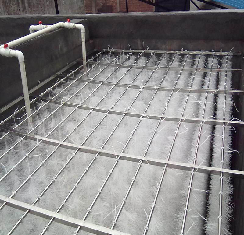 該填料篩選了聚烯烴類和聚酰胺中的幾種耐腐、耐溫、耐老化的優(yōu)質(zhì)品種,混合以親水、吸附、抗熱氧等助劑,采用特殊的拉絲,絲條制毛工藝,將絲條穿插固著在耐腐、高強度的中心繩上,絲條布置應呈立體狀,絲條表面應有微波紋,由于選材和工藝配方精良,剛?cè)徇m度,使絲條呈立體均勻排列輻射狀態(tài),制成了懸掛式立體彈性填料的單體,填料在有效區(qū)域內(nèi)能立體全方位均勻舒展?jié)M布,使氣、水、生物膜得到充分混滲接觸交換,生物膜不僅能均勻地著床在每一根絲條上,保持良好的活性和空隙可變性,而且能在運行過程中獲得愈來愈大的比表面積,又能進行良好的新陳代謝,這一特征與現(xiàn)象是國內(nèi)目前其他填料不可比擬的。