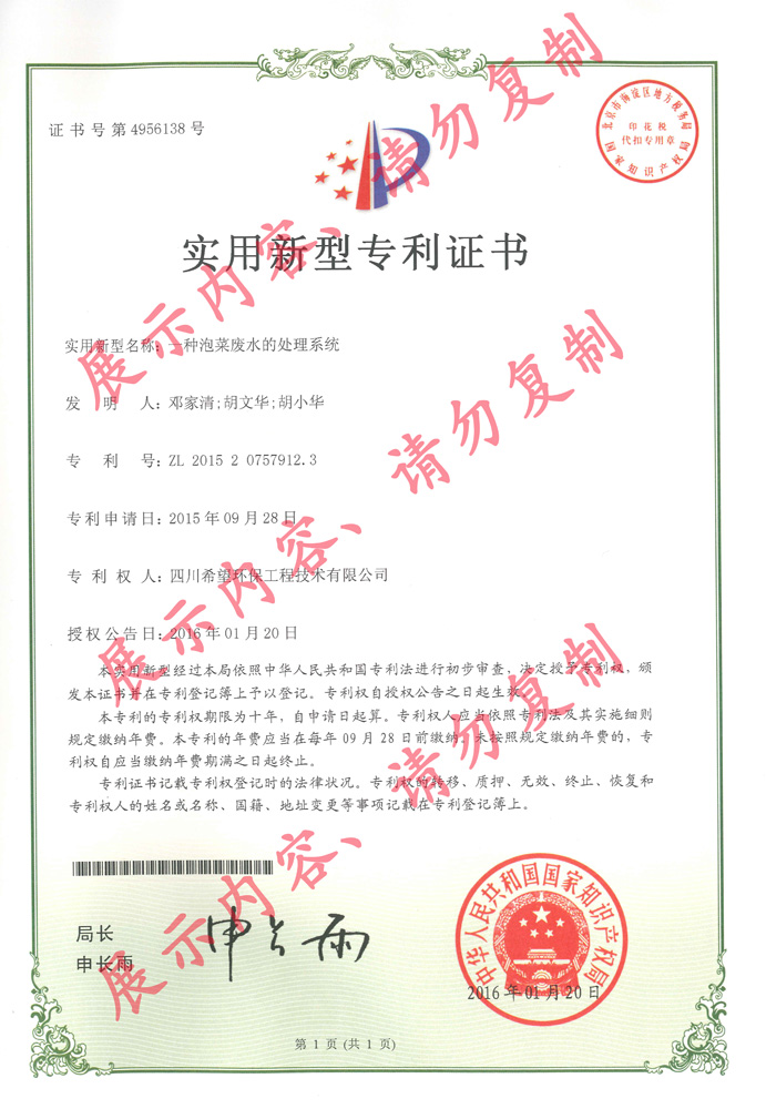 我公司取得實(shí)用新型專利證書(shū)(泡菜廢水),我公司已經(jīng)在多家泡菜企業(yè)成功應(yīng)用該技術(shù),專利證書(shū)的申請(qǐng),更好的保護(hù)我公司知識(shí)產(chǎn)權(quán)。