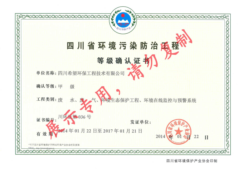 四川省環(huán)境污染治理等級(jí)確認(rèn)證書